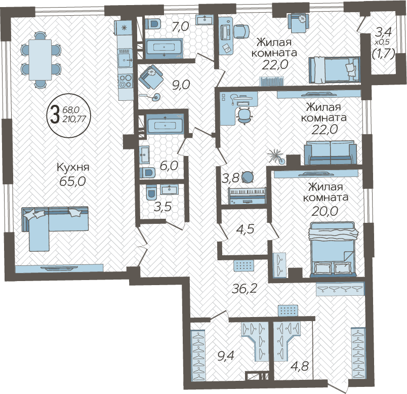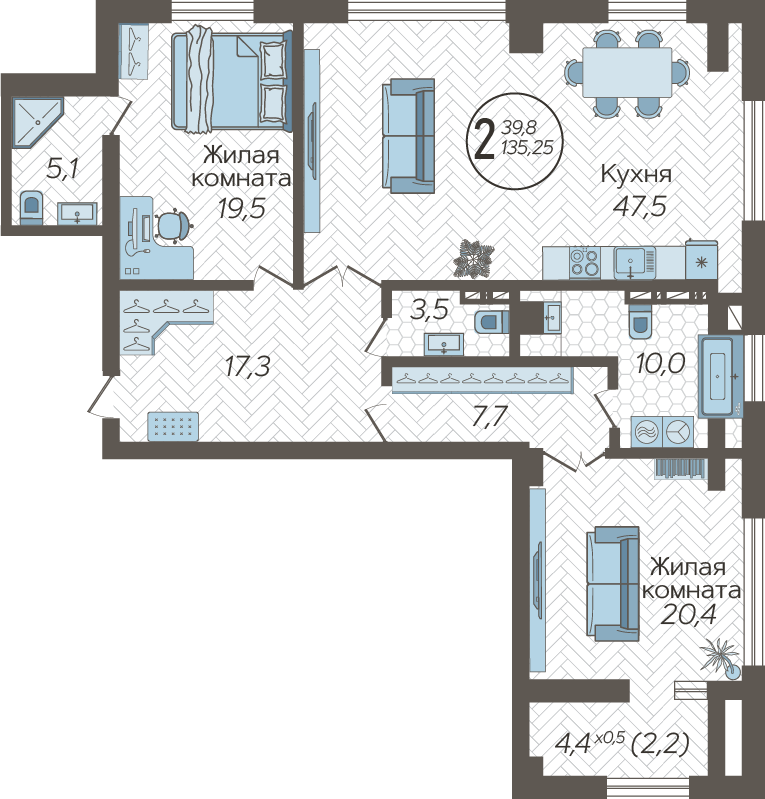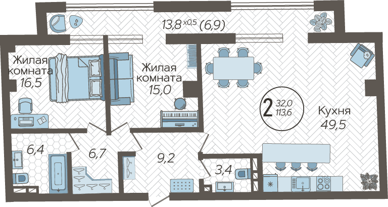 Планировка двухкомнатной квартиры с просторной гостиной и кухней. Установлено 2 санузла и большая ванная комната. Большую застекленную лоджию можно использовать как лаунж-зону и наслаждаться видом на центр города в приятной компании.