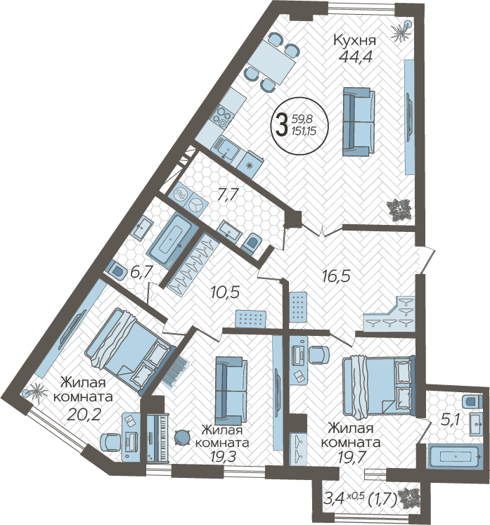 Планировка однокомнатной квартиры с просторной гостиной и кухней. В прихожей можно разместить гардеробную или вместительный шкаф-купе, чтобы максимально освободить пространство комнаты. Особенность: панорамные окна, окно в ванной